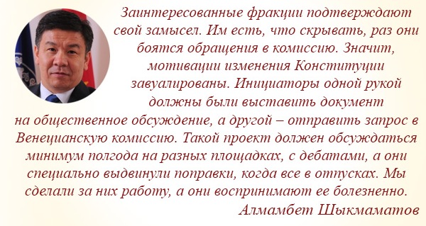 Резкие высказывания главы государства Текебаев воспринял более чем болезненно. Оклемавшись через пару дней, социалист все же высказал собственную позицию по инициируемым поправкам в Конституцию. При этом, памятуя о том, что не стоит злить президента, постарался весь свой негатив вылить на его окружение.