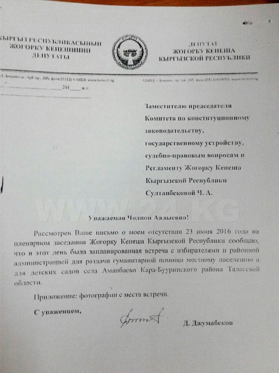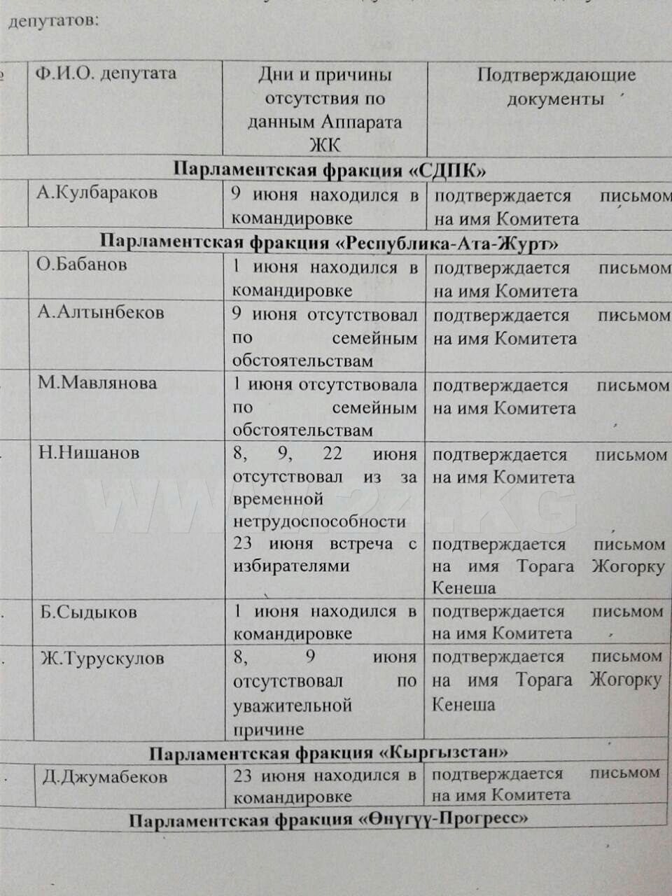 В связи с выездом (в рабочие командировки) отсутствовали депутат от СДПК Абтандил Кулбараков (поездка в Джумгальский район), лидер РАЖ Омурбек Бабанов и депутат этой фракции Бактыбек Сыдыков (поездка в пострадавший от селей Кадамджайский район), а также Дастанбек Джумабеков («Кыргызстан»), который участвовал в раздаче гумпомощи детсадам Таласской области.