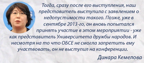 Однако Айнуру Алтыбаева напомнила, что по правилам БДИПЧ ОБСЕ участие любого выступающего согласовывается представителями 57 стран - участниц конференции. «Как может быть такое, что захотел - и выступил? ОБСЕ - это же не проходной двор! Мы, депутаты, по полгода готовимся к таким мероприятиям, а тут он захотел выступить, и ему просто так предоставили», - выразила недоумение она.