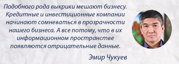 «Мы хотим принести прибыль аэропорту «Манас», ведем переговоры с иностранными инвесторами. Прибыль возможна и от реализации тех или иных субъектов бизнеса. Вмешательство политиков в нашу работу ни к чему хорошему не приведет. Пусть они занимаются принятием законов, думают над тем, какие принять поправки в нормативно-правовые акты или законы, чтобы улучшить положение бизнеса. Зачем вмешивать в свои игры стратегические предприятия?» - говорит Эмир Чукуев.