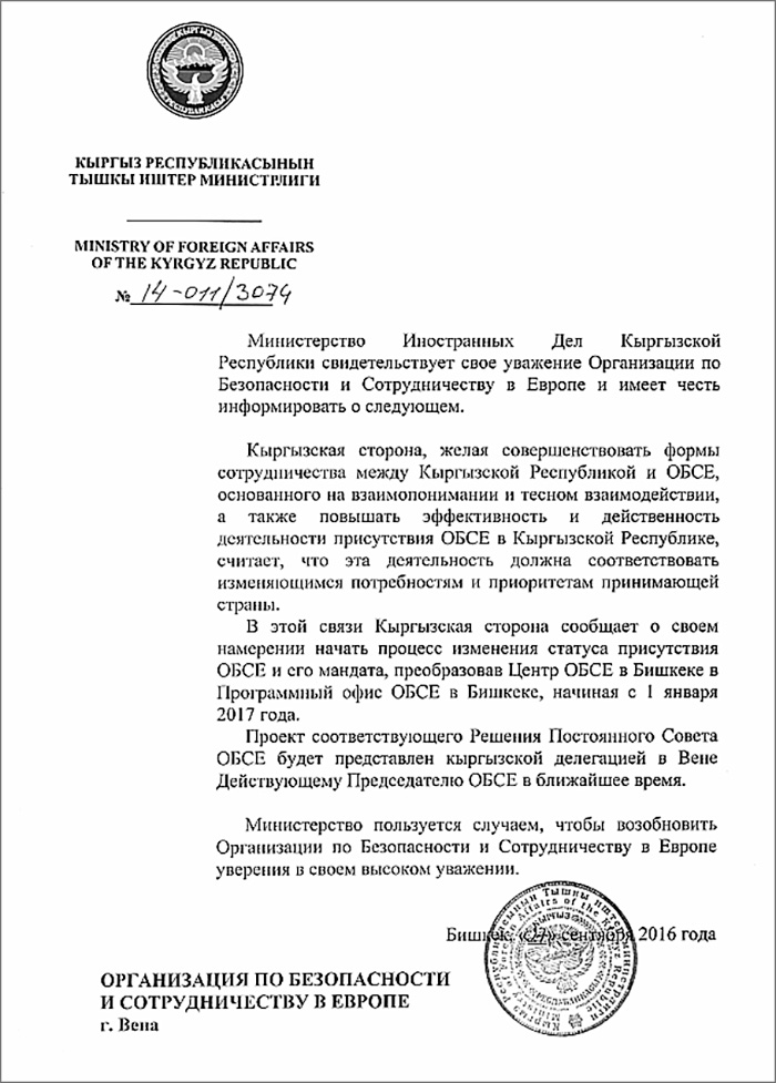 Как отмечает издание, 28 сентября Министерство иностранных дел Кыргызстана сообщило организации о намерении с 1 января 2017 года преобразовать Центр ОБСЕ в Бишкеке в Программный офис.