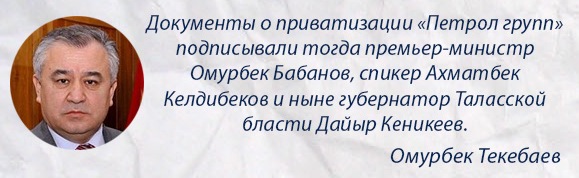 - По итогам первого конкурса по продаже «Петрол групп» победителем признали БНК, которая предложила 1 миллиард 555 миллионов сомов. Однако в тот же день БНК отказалась покупать «Петрол групп».