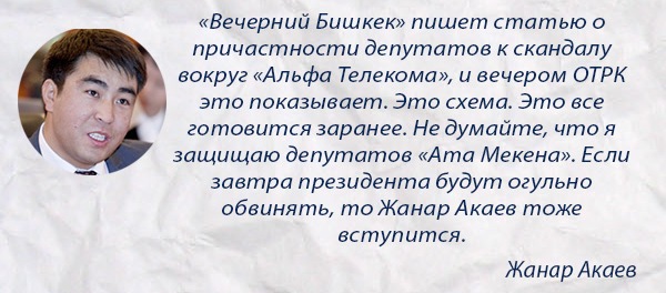 Член фракции СДПК отметил, что за всю недостоверную информацию несет ответственность человек, который ее написал. Также Жанар Акаев подчеркнул, что уважает главу ОТРК как коллегу и депутата. Но претензии все же предъявил.
