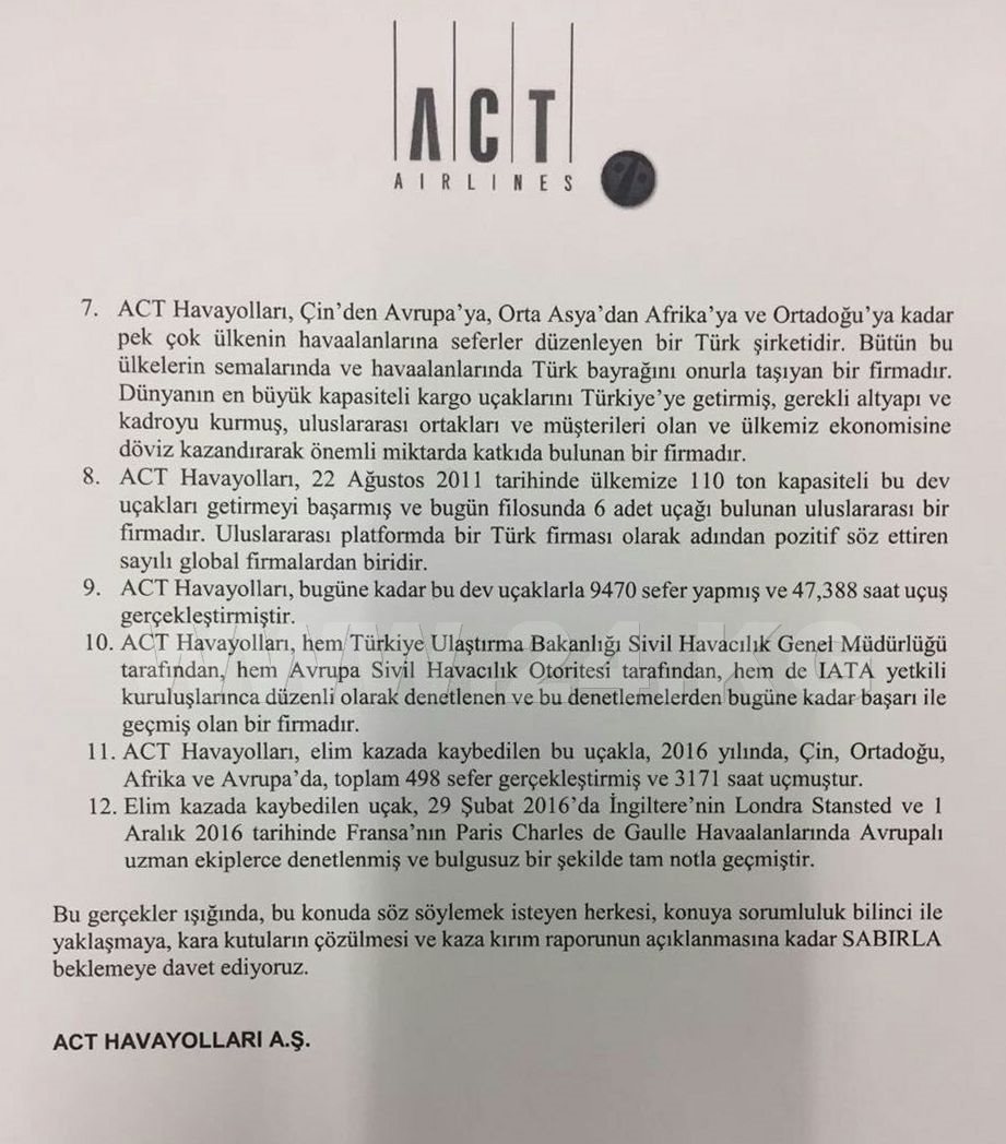 ACT Airlines отмечает, что работа компании была высоко оценена как турецкими авиационными властями, так и европейской комиссией по безопасности полетов, а также ИКАО.