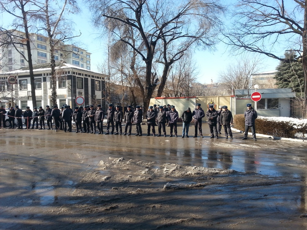 Здание ГКНБ оцепленно милицией. Из проезжающих машин доносятся крики: «Свободу Текебаеву!», «Свободу журналистам!».