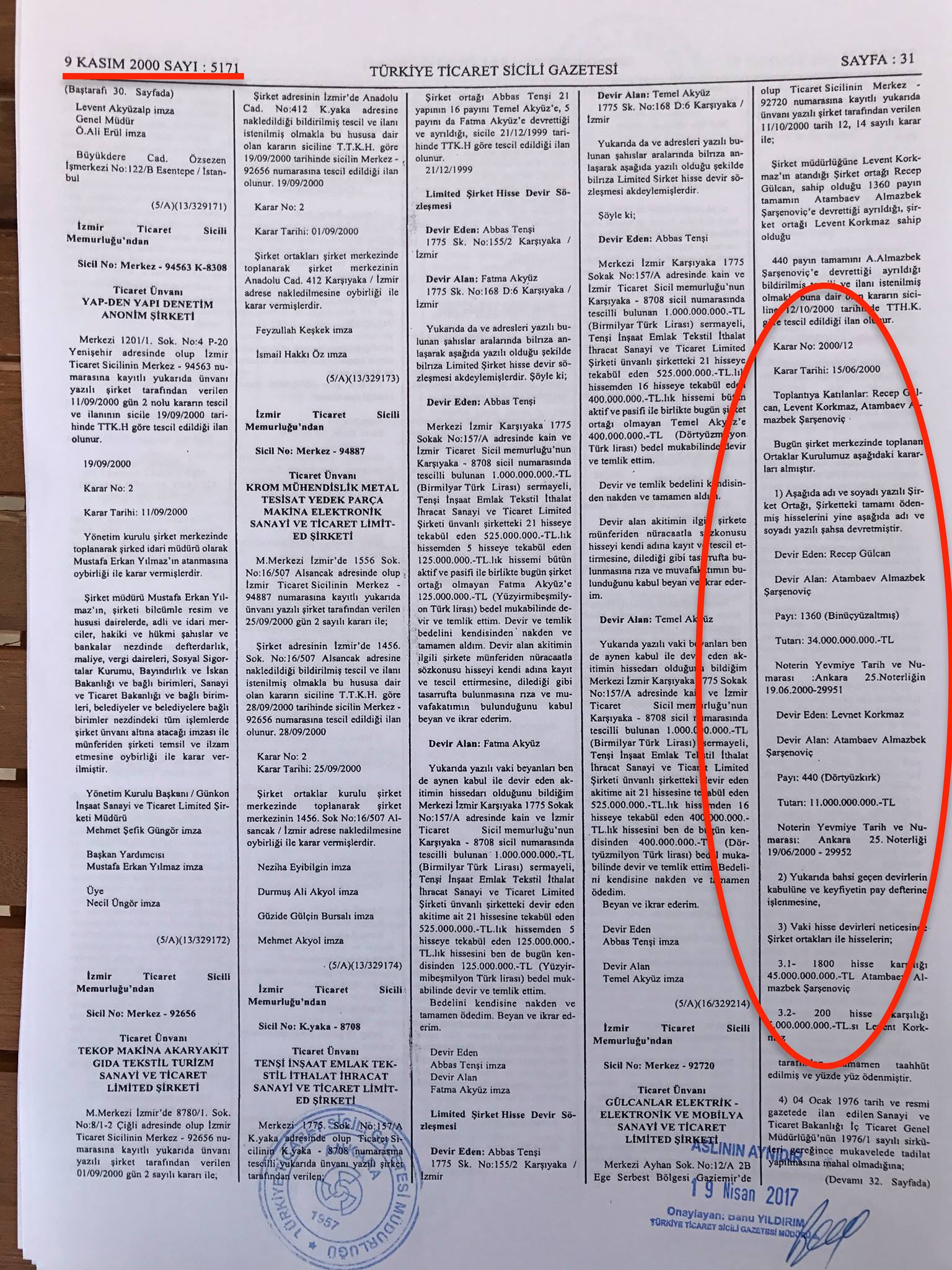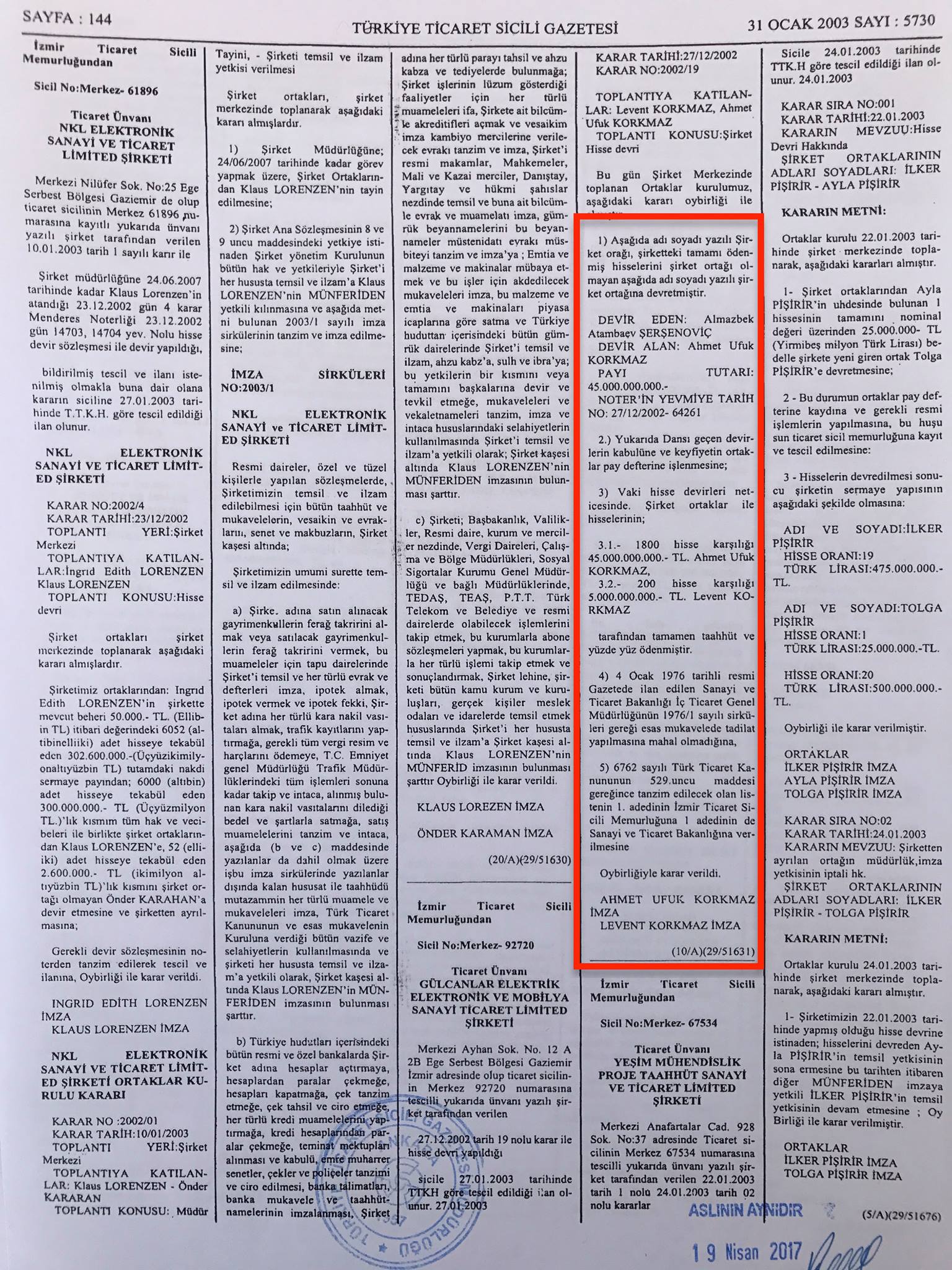 «Продавцами выступили Реджеп Гюльжан (1360 акций) и Левент Коркмаз (440 акций). Таким образом, Алмазбек Атамбаев стал 90-процентным владельцем акций в Gulcanlar Elektrik Elektronik. Еще 10 процентов (200 акций) принадлежали Левенту Коркмазу. Но Gulcanlar Elektrik Elektronik не была преобразована в Elektromed Elektronik, как об этом заявила 12 апреля 2017 года пресс-служба Атамбаева», — подчеркнул Эдиль Байсалов.