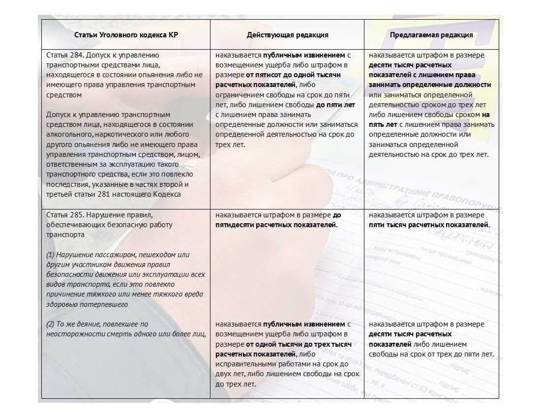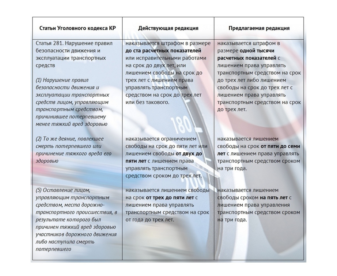 По мнению депутата, эта статистика будет неуклонно расти при наличии коррупционных норм, позволяющих избегать уголовного наказания. Кроме того, он предлагает увеличить штрафы. Так, за причинение менее тяжкого вреда здоровью пострадавшего в ДТП предусмотрен штраф в 100 тысяч сомов либо лишение свободы на срок до трех лет.