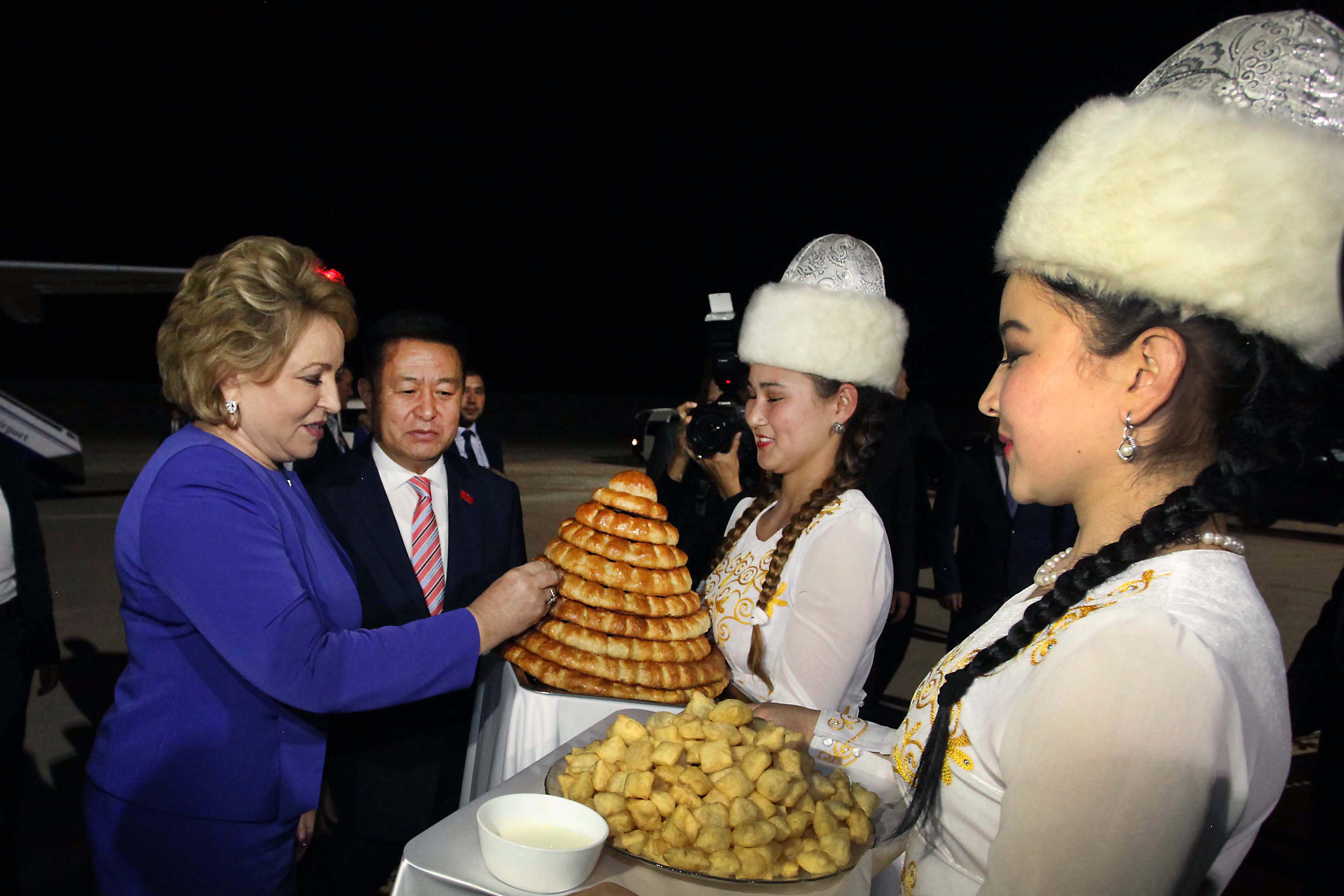 Валентину Матвиенко также встречали полномочный представитель правительства в Иссык-Кульской области Узарбек Жылкыбаев и заместитель генерального секретаря Совета Межпарламентской ассамблеи СНГ — полномочный представитель Жогорку Кенеша Нурбек Сатвалдиев.