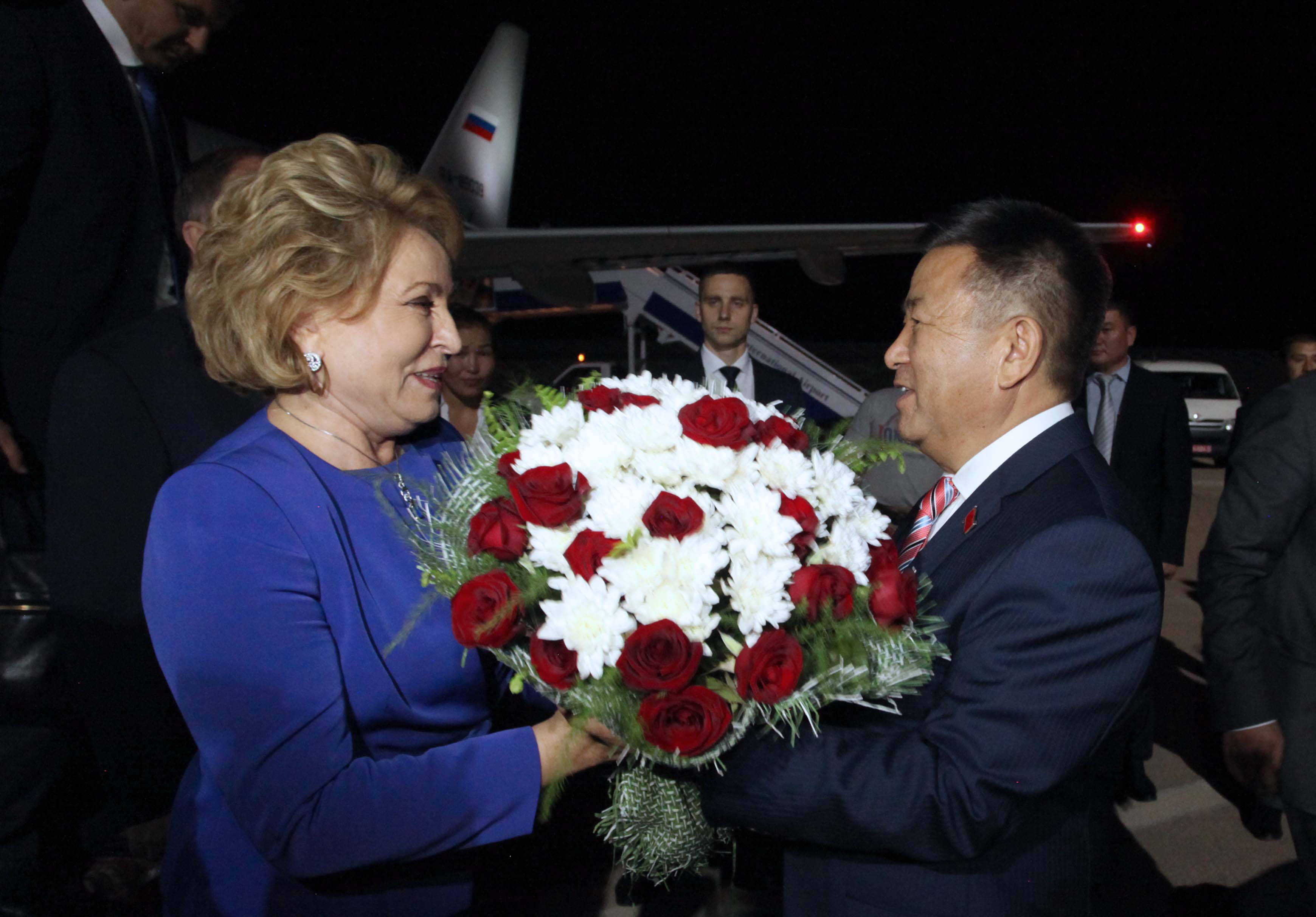 Председатель Совета Федерации России Валентина Матвиенко после встречи с президентом Кыргызстана прилетела в Иссык-Кульскую область. Гостью в международном аэропорту «Иссык-Куль» («Тамчи») встречал торага Жогорку Кенеша Чыныбай Турсунбеков.