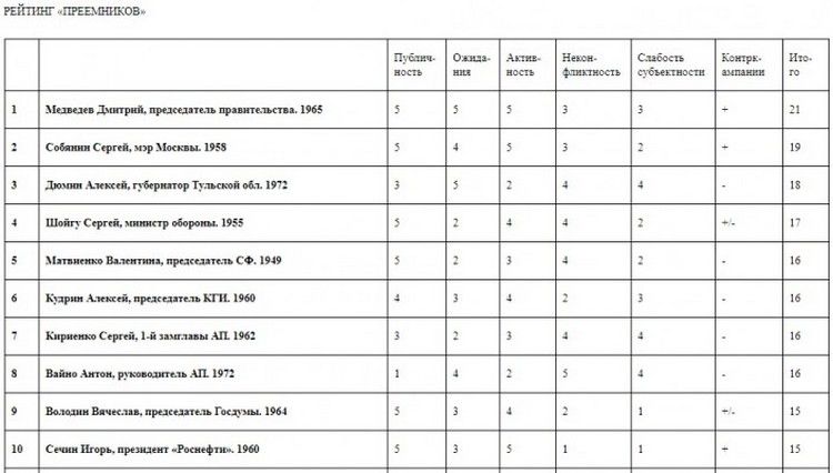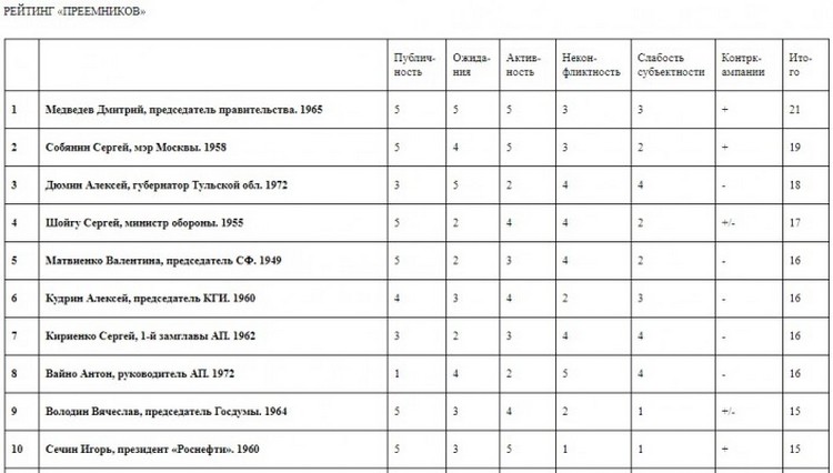 Как уточняет фонд, в список включены персоны, наиболее часто фигурировавшие в раскладах в числе гипотетических «преемников» или наиболее активно претендовавшие на эту роль.