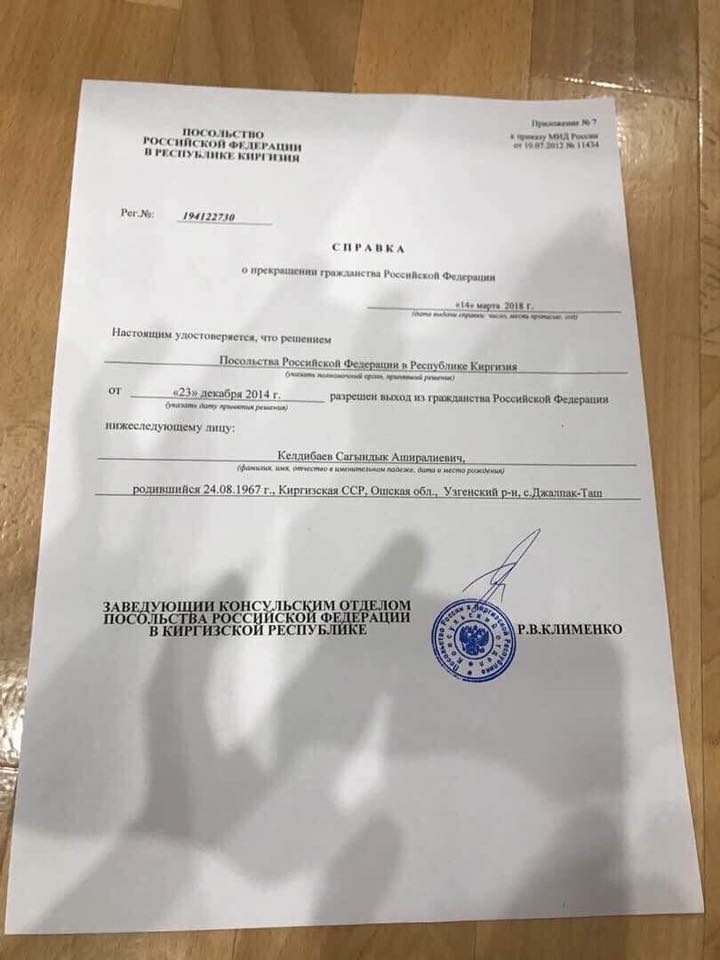 Пользователь Facebook Ыргал Кадыралиева опубликовала сегодня справку о выходе Сагындыка Келдибаева из российского гражданства.