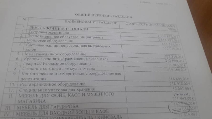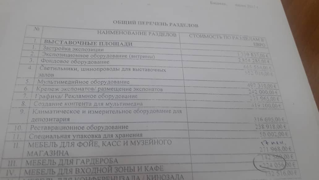 По данным Госстроя, на приобретение мебели для Исторического музея выделено 890 миллионов сомов, на внутреннюю отделку музея — 690 миллионов сомов.