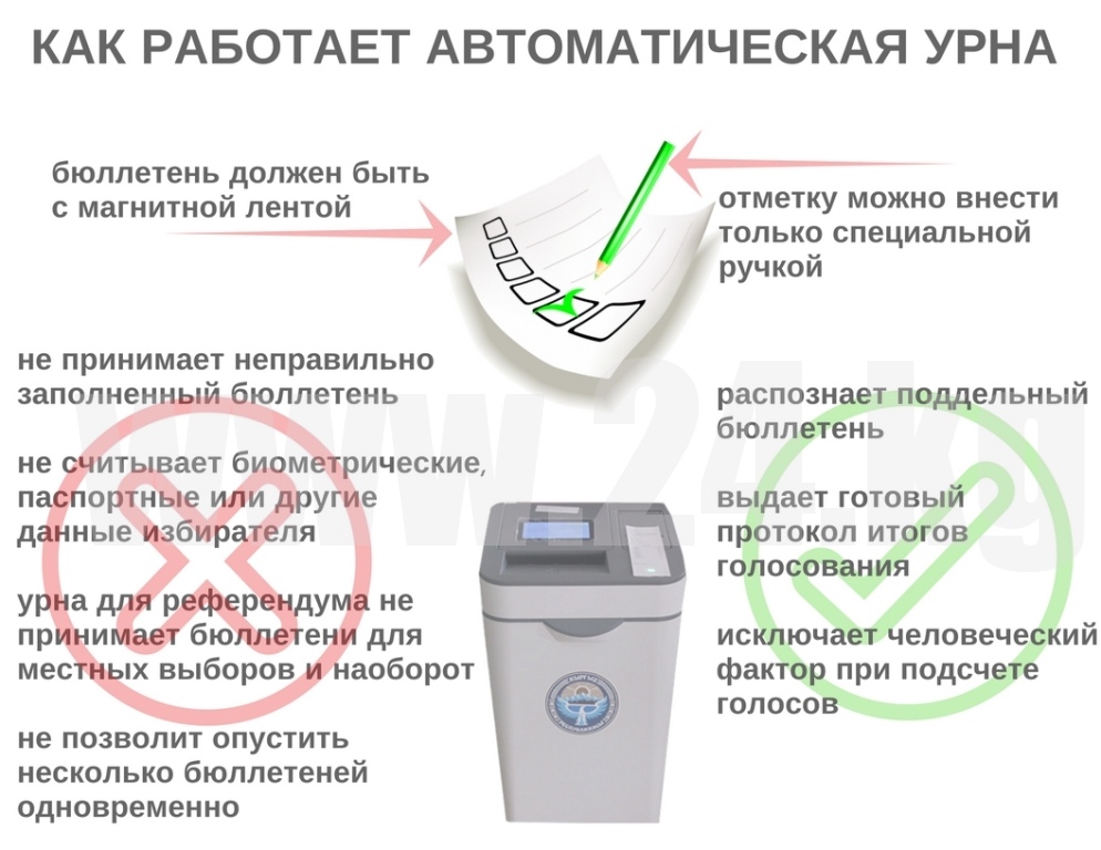 Как рассказал председатель Государственной регистрационной службы Тайырбек Сарпашев, прежде чем принять участие в голосовании, избиратель должен пройти идентификацию и получить чек, в обмен на который выдается бюллетень. Число идентифицированных избирателей должно равняться числу проголосовавших. Если количество бюллетеней больше – произошел вброс, если меньше – кто-то унес бланк с собой.