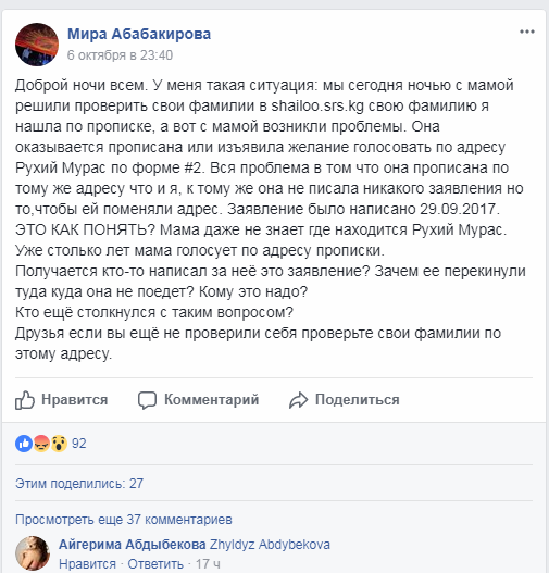 «Решили с мамой проверить свои фамилии в shailoo.srs.kg. Свою фамилию я нашла по прописке, а вот с мамой возникли проблемы. Она, оказывается, прописана или изъявила желание голосовать в новостройке «Рухий Мурас» по форме № 2. Проблема в том, что она прописана по тому же адресу, что и я, к тому же не писала заявления на то, чтобы ей поменяли адрес. Заявление написано 29 сентября. Как это понимать? Мама даже не знает, где находится «Рухий Мурас». Получается, кто-то написал за нее заявление? Зачем ее перекинули туда, куда она не поедет? Кому это надо?» — задается вопросом пользователь.