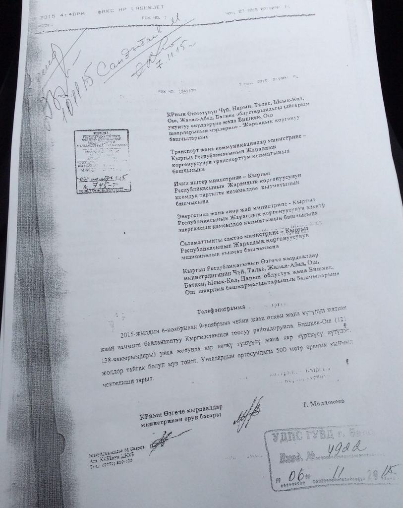 В ИА «24.kg» попал документ, имеющий косвенное, а может, и непосредственное отношение к задержанию. Министерство чрезвычайных ситуаций направило в ДПС документ, канцелярия поставила печать исходящего сообщения 7 ноября 2015 года.