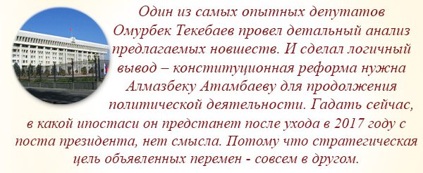 Локомотивом парламентской оппозиции неожиданно стал лидер фракции «Ата Мекен» Омурбек Текебаев, входящий в состав коалиции. Но его, кстати, неожиданно для многих, единственного из лидеров парламентского большинства не пригласили на рандеву с президентом, где Алмазбек Атамбаев ознакомил авторов поправок в Конституцию собственно с самими поправками и объяснил необходимость реформы Основного закона.