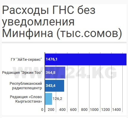 С ГУ заключен договор на 2 миллиона 288,6 тысячи сомов. Из бюджетных средств выплатили 1 миллион 476,2 тысячи сомов. Структура, штатное расписание, смета расходов утверждены директором ГУ «АйТи-сервис» и согласованы с председателем ГНС.