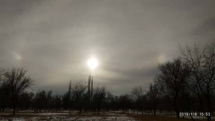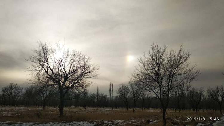 «Во время прогулки в парке за Южной магистралью (8-й микрорайон) сделала снимок интересного явления Гало. Хотя время 15.53, снимок получился темным... Да и не фотограф я... Было интересно наблюдать, думала, что просто сквозь облака прорывается луч солнца. Присмотревшись, поняла — три солнца», — написала жительница Бишкека Соня Айдарбаева.