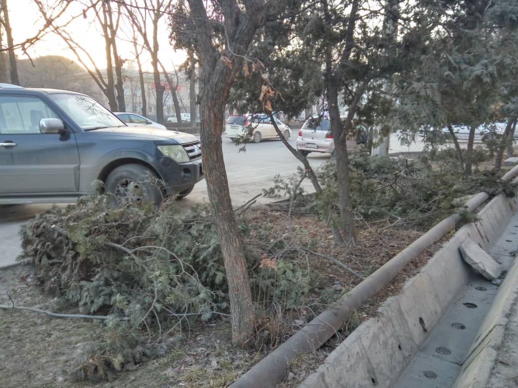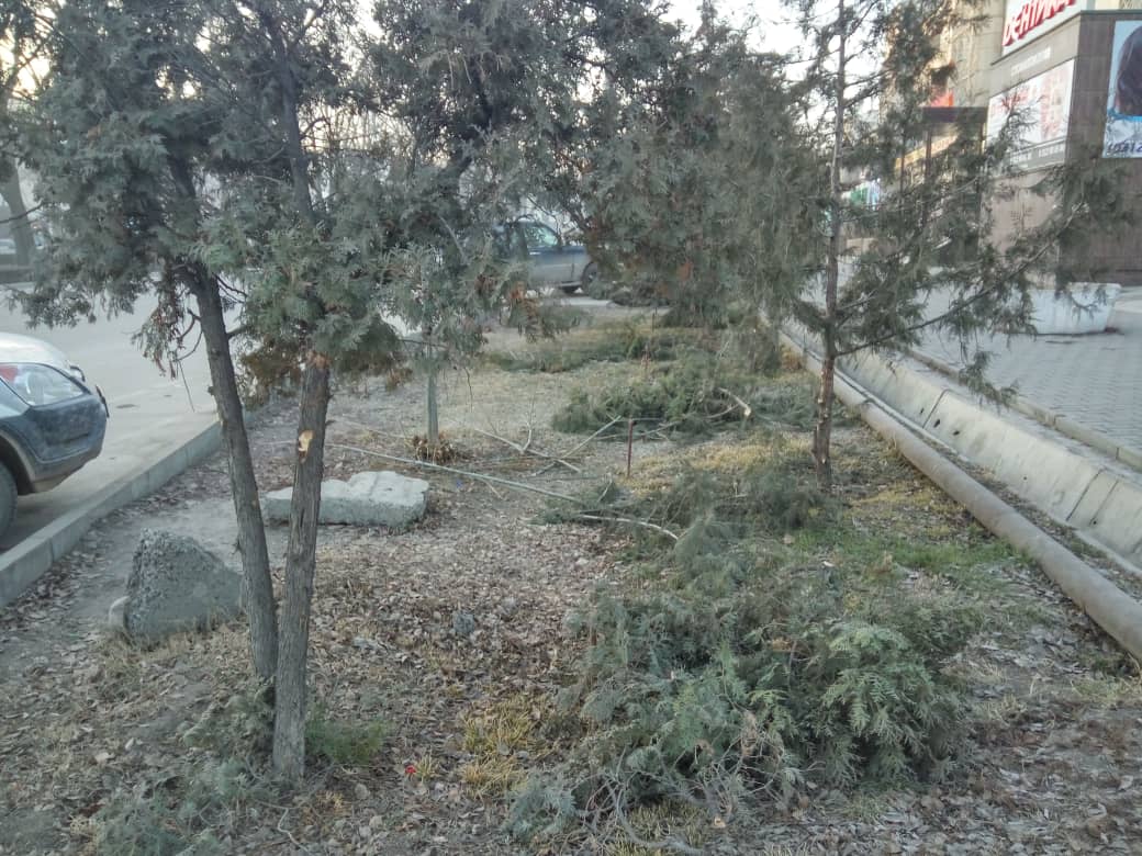 По его словам, вдоль улицы Ибраимова еще на прошлой неделе обрубили нижние ветки арчи.
