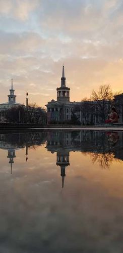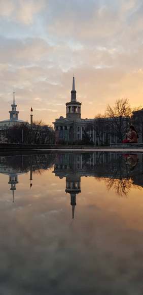 Очень красивую фотографию сделал в Бишкеке Роман Вершинский. После дождя здание Международного университета Кыргызстана увидело свое отражение в луже.