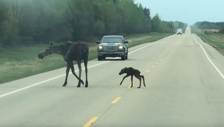 В канадской провинции Северная Альберта сняли видео, как лосиха с детенышем переходит трассу. Ролик появился на YouTube-канале ViralHog.