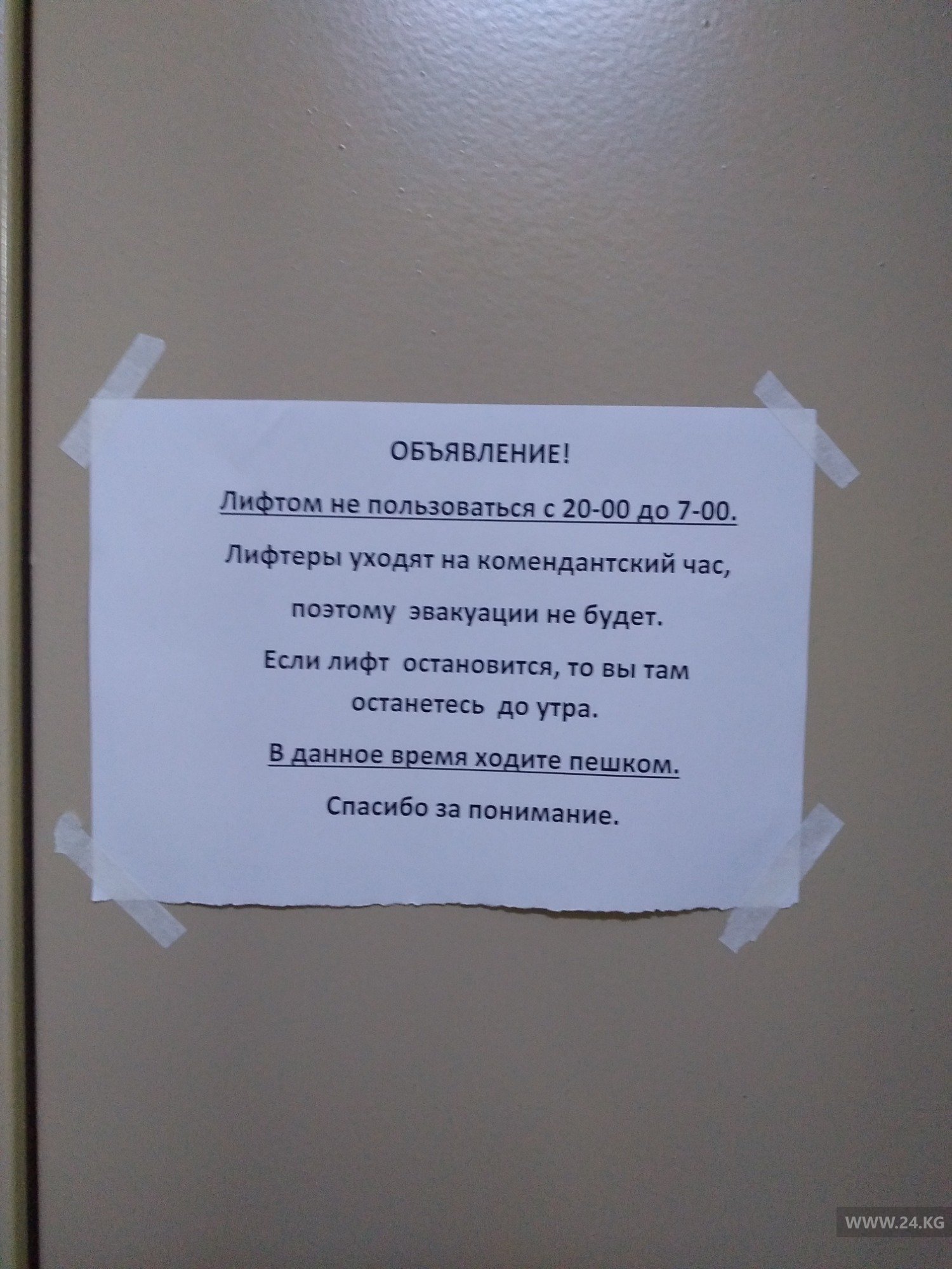 В Бишкеке лифты в многоэтажных домах во время комендантского часа перестали работать. Об этом 24-kg.com сообщил читатель.
