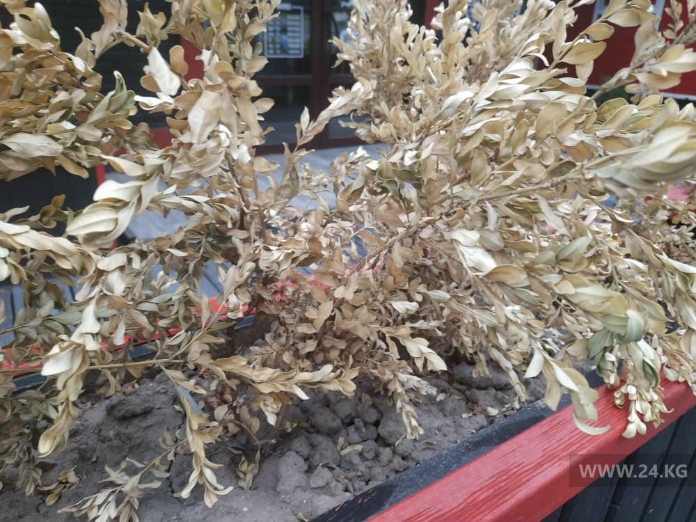 Возле кафе Brooklyn на улице Токтогула в Бишкеке в вазонах высохли растения. Об этом 24-kg.com сообщил читатель.