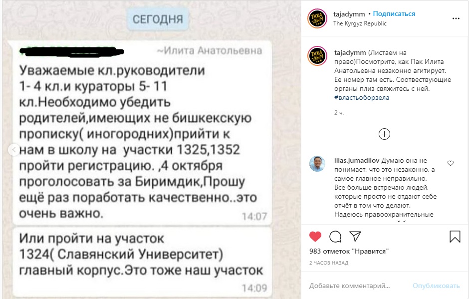 В Сеть выложили скриншот сообщения от директора общеобразовательного учреждения, где она обращается к классным руководителям 1-4-х и кураторам 5-11-х классов. «Необходимо убедить родителей, имеющих не бишкекскую прописку, прийти к нам в школу и пройти регистрацию, а 4 октября проголосовать на партию. Прошу еще раз поработать качественно, это очень важно», — говорится в сообщении.