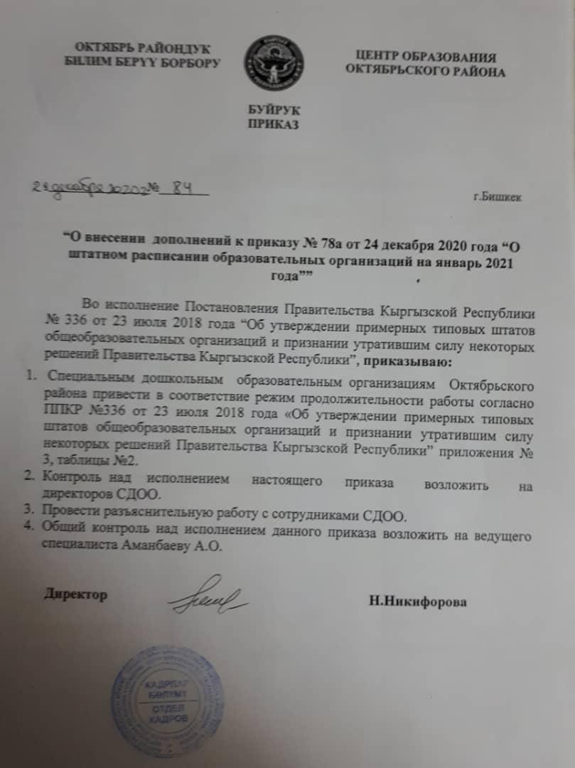 Фото читательницы 24-kg.com. Приказ об изменении штатного расписания образовательных организаций