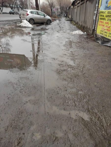 В Бишкеке на улице Толстого с потеплением тротуары превратились в непроходимое грязевое болото. Об этом в Facebook написал житель города Тологон Нанаев.