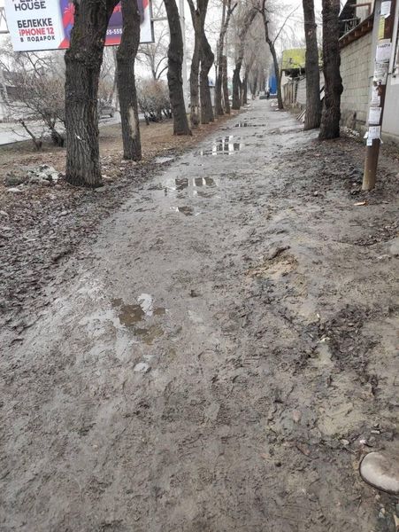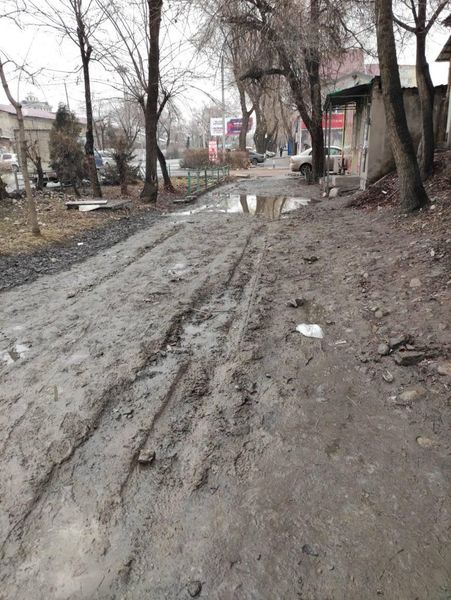 «На улице Толстого, участок от проспекта Манаса до улицы Игембердиева, после вчерашнего мокрого снега тротуар превратился в «танковый полигон» или даже, лучше сказать, в полосу препятствий, которую практически невозможно преодолеть. Кто у нас в мэрии за это ответственен, как люди должны проходить по этой грязи?» — задается вопросами бишкекчанин.