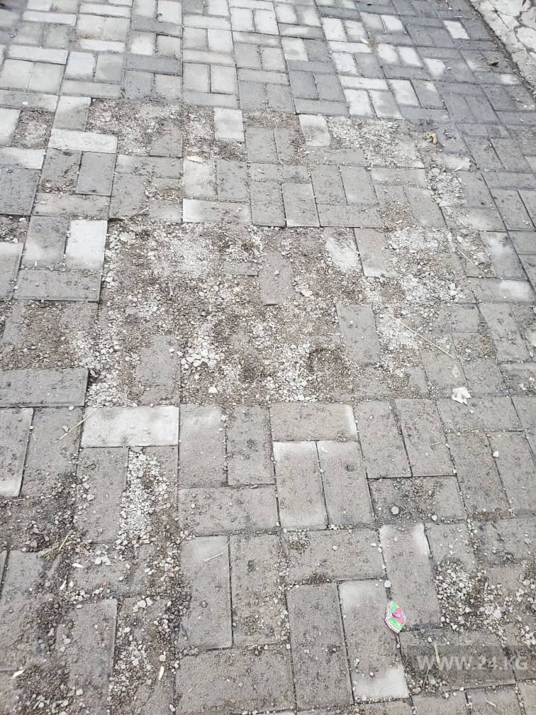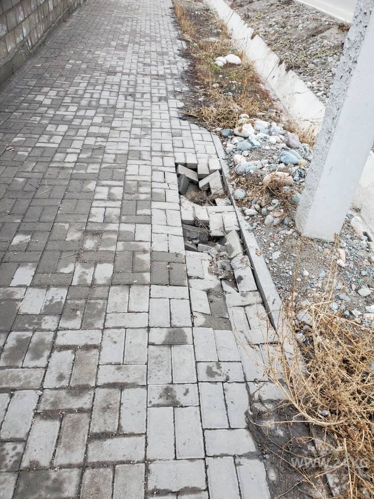 Новая брусчатка тротуара на улице Каралаева в Бишкеке разрушается. Об этом 24-kg.com сообщил читатель.