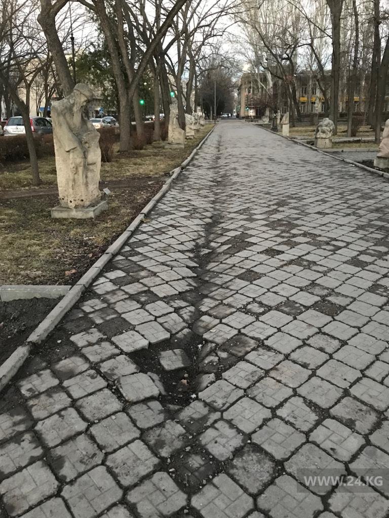 В Дубовом парке Бишкека разрушается тротуар. Об этом 24-kg.com сообщил читатель.