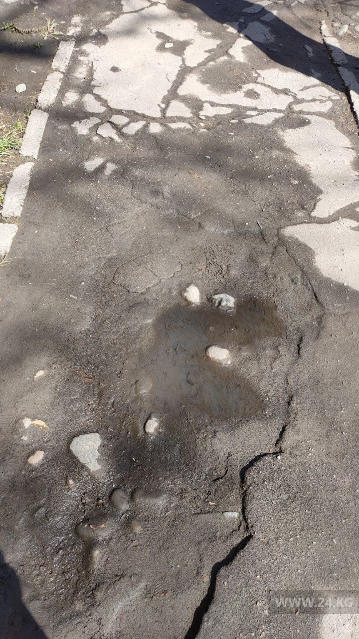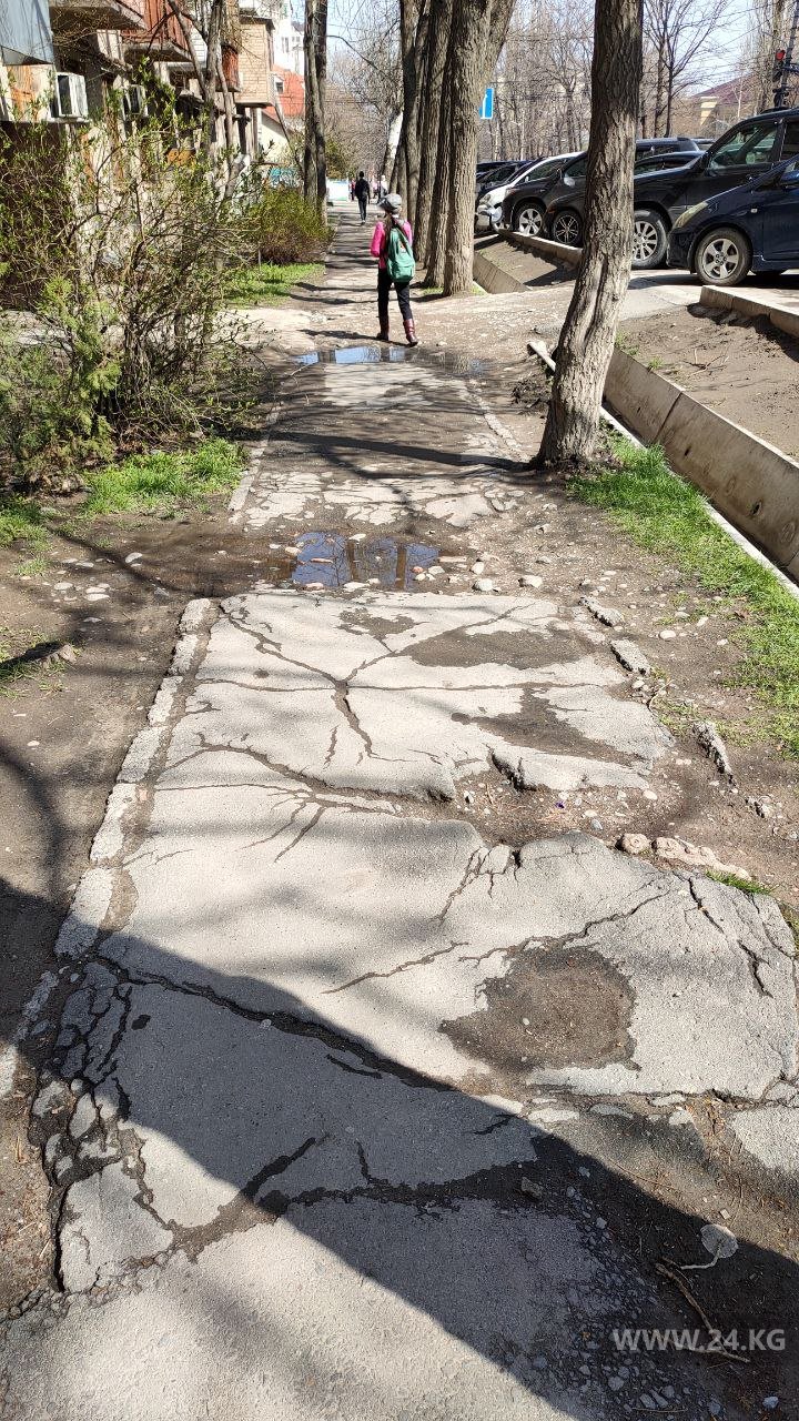 «Я поражаюсь тому, как следят за состоянием тротуаров практически в центре Бишкека. Сколько помню, здесь всегда была ужасная пешеходная дорожка, кругом ямы. Когда идет дождь, постоянно лужи и пройти невозможно», — написала читательница.