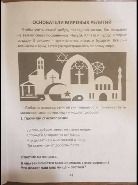 «В четвертом классе есть такие темы: этические нормы и правила в разных религиях — буддизм, христианство, ислам. Но углубленно религию дети не изучают. Преподаватели сами находят пособия, берут материалы из интернета — в основном это российские рабочие тетради. В силу своих возможностей преподают этот предмет. Но насколько я знаю, со следующего года этику преподавать уже не будут, потому что ее интегрируют с родиноведением», — заключила Чынара Бактыгулова.