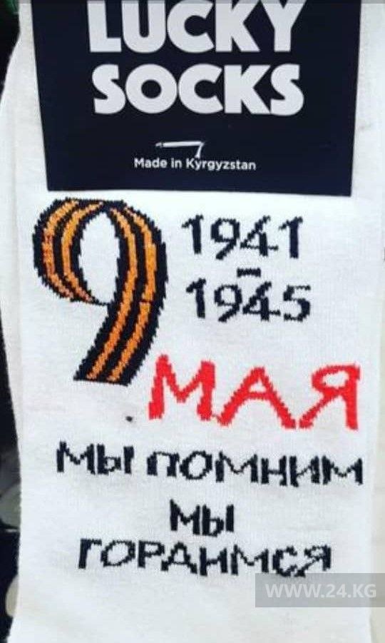 В Кыргызстане одна из фирм выпустила носки ко Дню Победы. Об этом 24-kg.com сообщил читатель. На присланных редакции снимках — белые носки с надписью. «9 мая. 1941-1945. Мы помним, мы гордимся». По словам читателя, он увидел их в продаже в одном из гипермаркетов столицы.