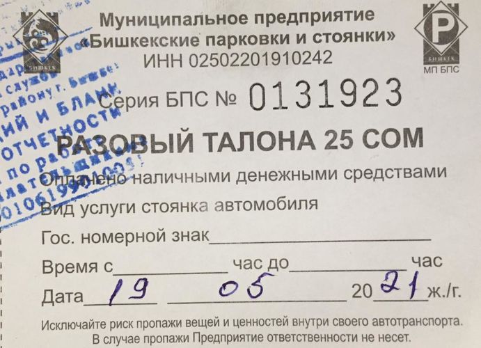 Талон выдается муниципальным предприятием «Бишкекские парковки и стоянки».
