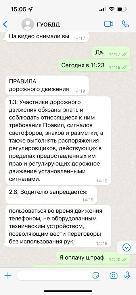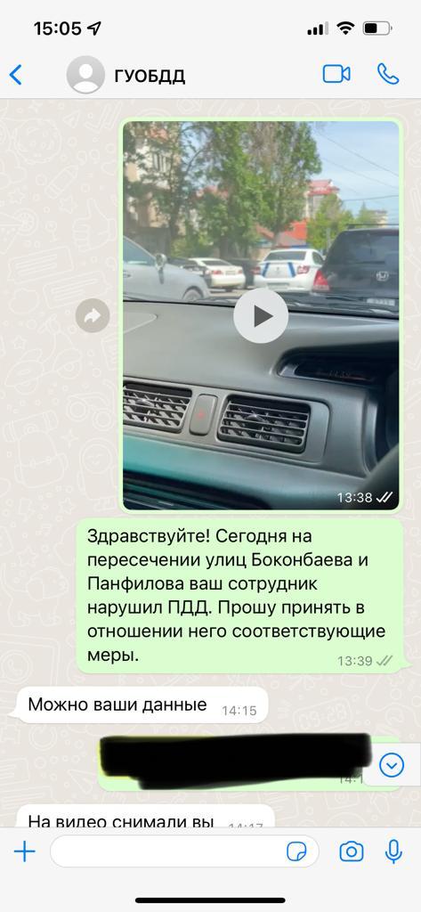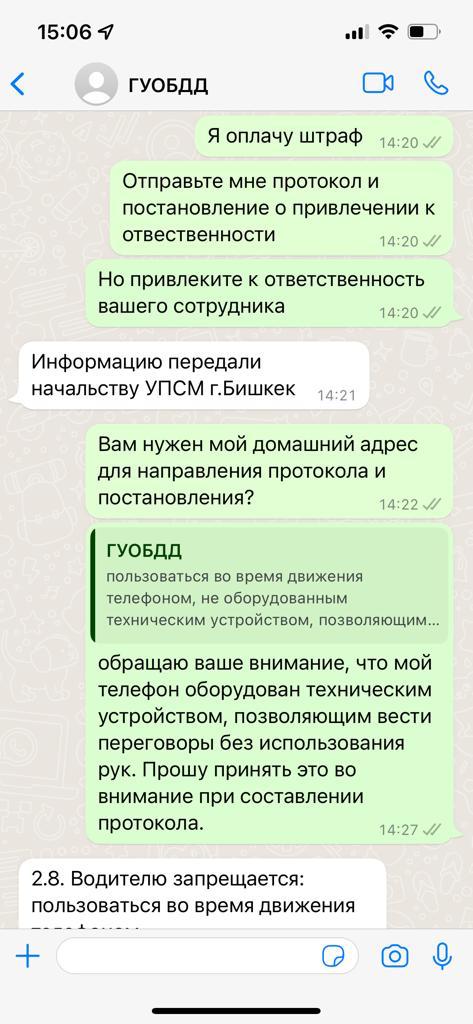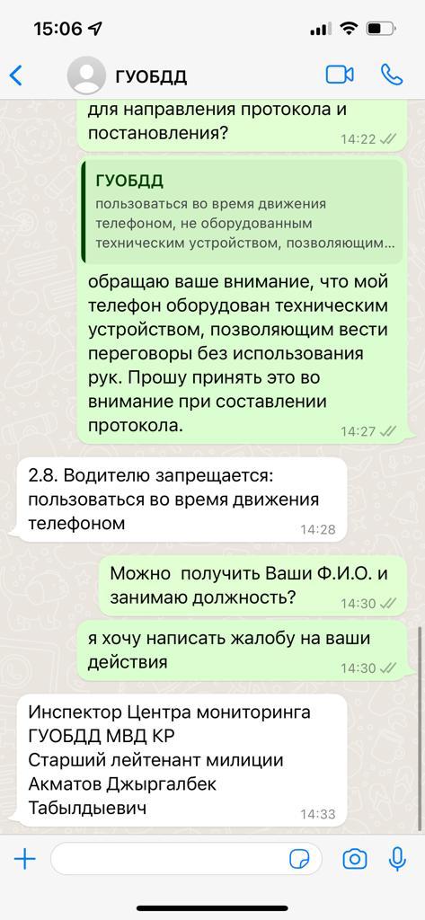Однако инспектора центра мониторинга ГУОБДД Джыргалбека Акматова (так он представился в переписке) больше заинтересовало не нарушение ПДД со стороны сотрудников УПСМ, а то, кто снял это видео. Инспектор отправил очевидцу статью закона, где говорится, что водителю запрещено пользоваться телефоном во время движения.