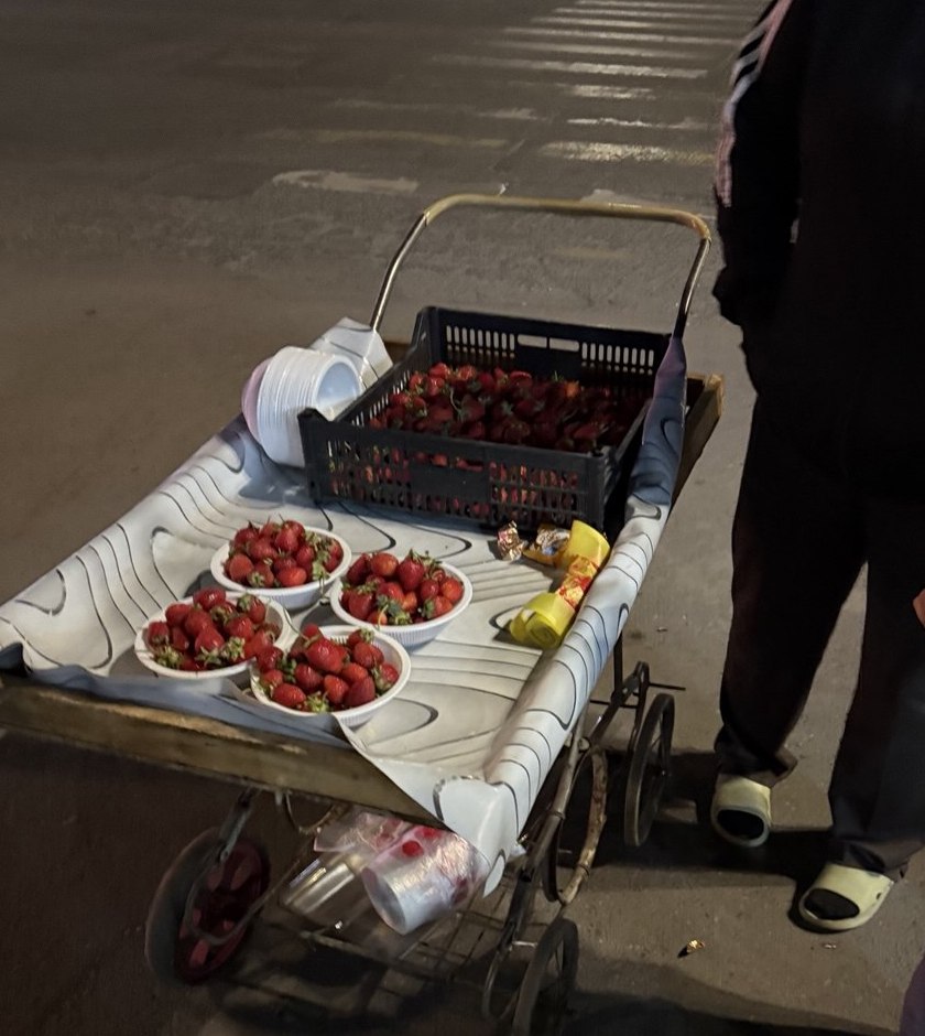 По словам одной из посетительниц, восьмилетний ребенок подходил к столикам и предлагал купить клубнику за 200 сомов. На вопрос, где родители, девочка указала на улицу. Администратор и гостья заведения последовали за ней и на углу увидели женщину с тележкой.