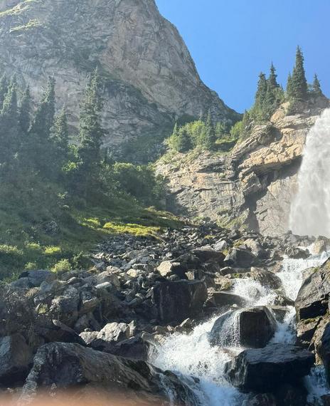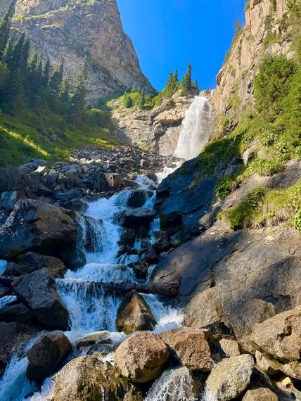 Отправимся в Барскоонское ущелье и полюбуемся «Брызгами шампанского» — одним из самых высоких водопадов Кыргызстана (более 60 метров). В ущелье есть и другие водопады — «Борода Аксакала» и «Чаша Манаса». Там побывал и сделал фотографии Эмиль Жээнбеков.