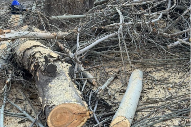 В Бишкеке возле кафе Lale Doner на пересечении улиц Ахунбаева и Шукурова без разрешительных документов спилили тополь. Об этом 24-kg.com сообщили жители близлежащих домов.