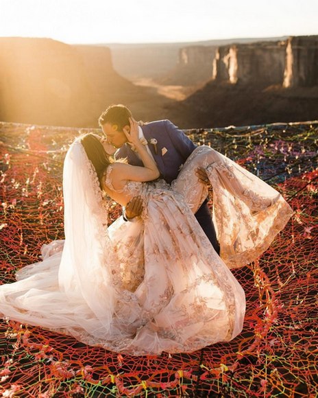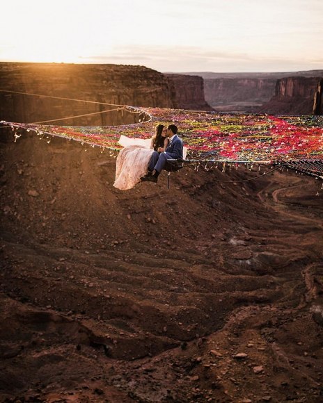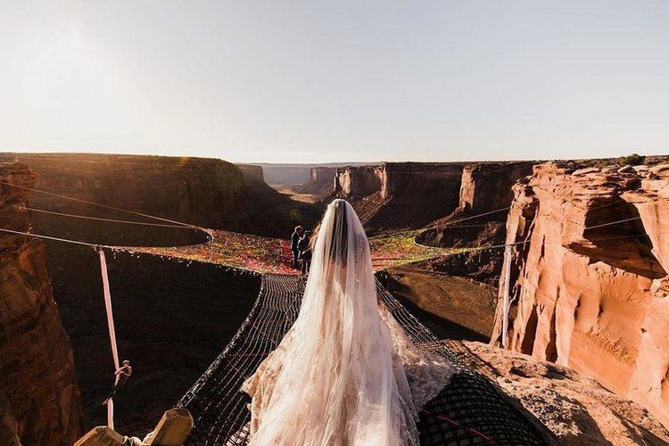 Райан Дженкс с Кимберли Веглин познакомились в горах Моав, поэтому решили связать себя узами брака там же. Для этого они наняли американского канатоходца Энди Льюиса и авантюрных фотографов The Hearnes.