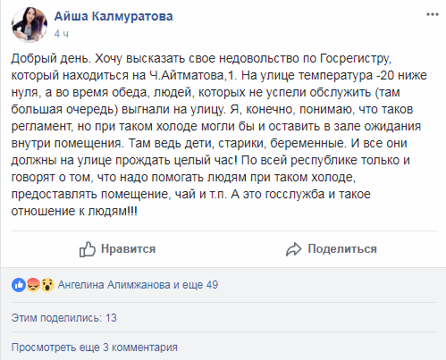 «Хочу высказать свое недовольство Госрегистру по проспекту Ч.Айтматова, 1. На улице -20, а во время обеда людей, которых не успели обслужить, выгнали на улицу. Я, конечно, понимаю, что таков регламент, но при таком холоде могли бы и оставить в зале ожидания. Там ведь дети, старики, беременные. И все они должны на улице прождать целый час. По всей республике только и говорят о том, что надо помогать людям при таком холоде, предоставлять помещение, чай. А это госслужба, и такое отношение к людям», — написала она.
