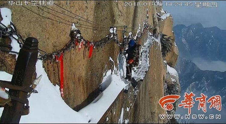 С одной стороны — отвесная скала, с другой — пропасть, на небесном мосту на горе Хуашань в Китае помещается лишь один человек, который лопатой расчищает путь. Об этом пишет газета «Жэньминь жибао».