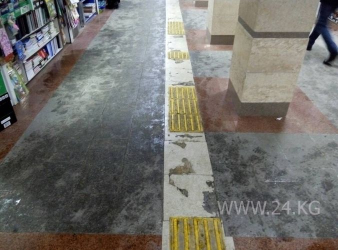 Дорожки для незрячих отклеились и в подземке у филармонии. Об этом сообщил читатель ИА «24-kg.com».
