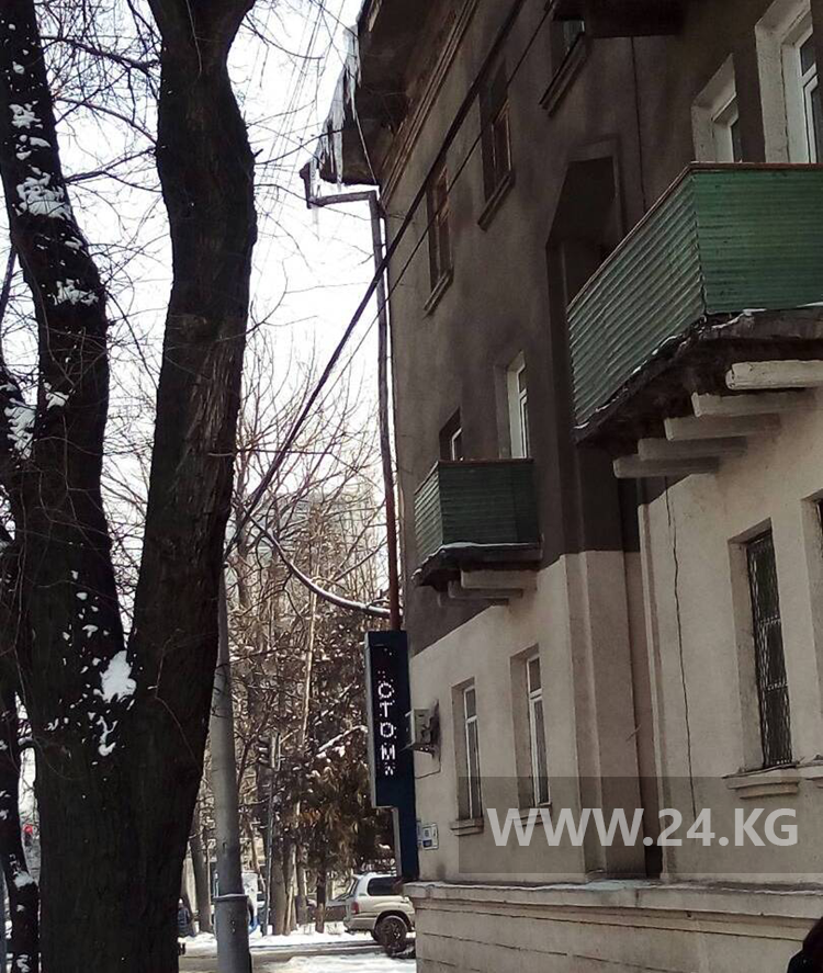 На пересечении улицы Киевской и бульвара Эркиндик с крыши свисают огромные глыбы льда. Фото опасных сосулек ИА «24-kg.com» прислал читатель.