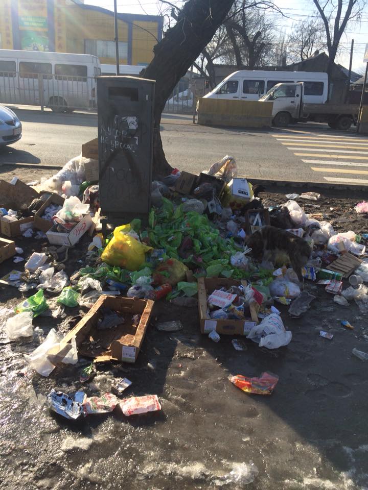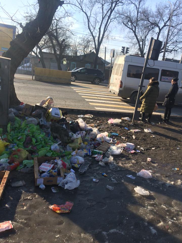 «Недавно было сообщение, что мусорные баки в «Кызыл-Аскере» стоят рядом со светофором. Баки убрали, а проблема осталась — кучи мусора рядом с пешеходным переходом, пакеты летают, собаки таскают. Рядом стоит тандыр, прилавки с овощами и гриль. Нельзя обязать магазины относить мусор в мусорку через дорогу?» — задается вопросом пользователь.