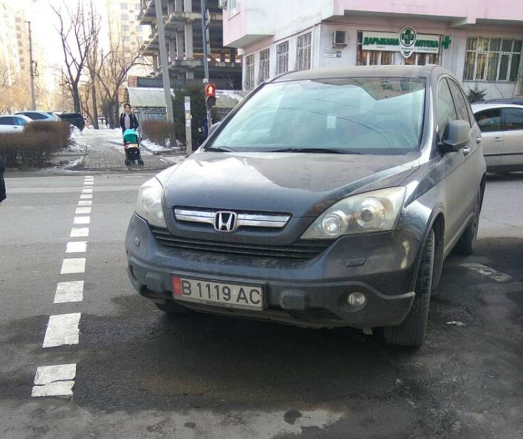 Фото нарушителя ПДД, оставившего машину на пешеходном переходе на пересечении улиц Панфилова и Боконбаева, на WhatasApp ИА «24-kg.com» прислал читатель.