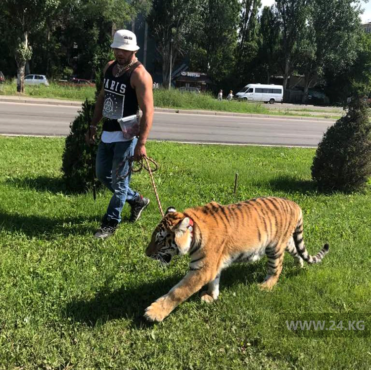 В Бишкеке на улице Токомбаева мужчина выгуливает тигра. Об этом ИА «24-kg.com» сообщили читатели.