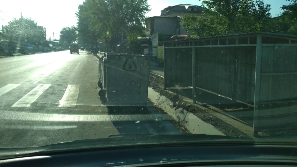 После ремонта улицы Баялинова площадка для мусорных баков осталась за бордюром, и теперь контейнеры стоят на пешеходном переходе. Об этом ИА «24-kg.com» сообщил читатель.